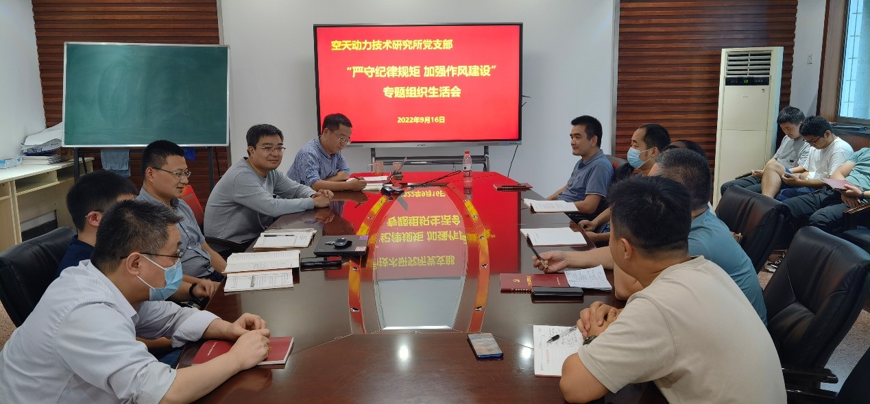 2022年9月16日,beats365官方唯一入口空天动力技术研究所党支部召开“严守纪律规矩 加强作风建设”专题组织生活会。会议由党支部书记吕翔同志主持,支部联系人beats365官方唯一入口宁昕副经理参会。