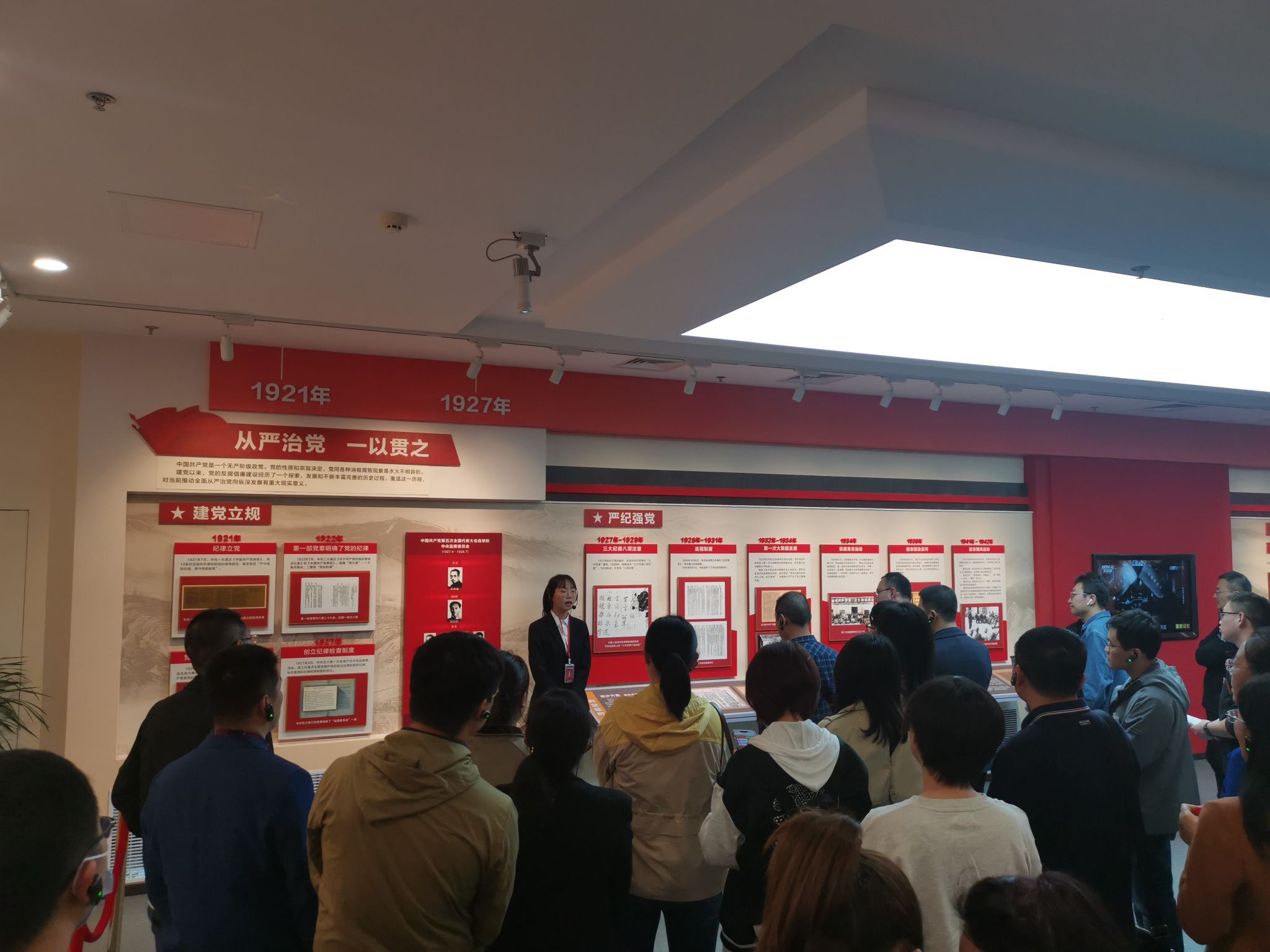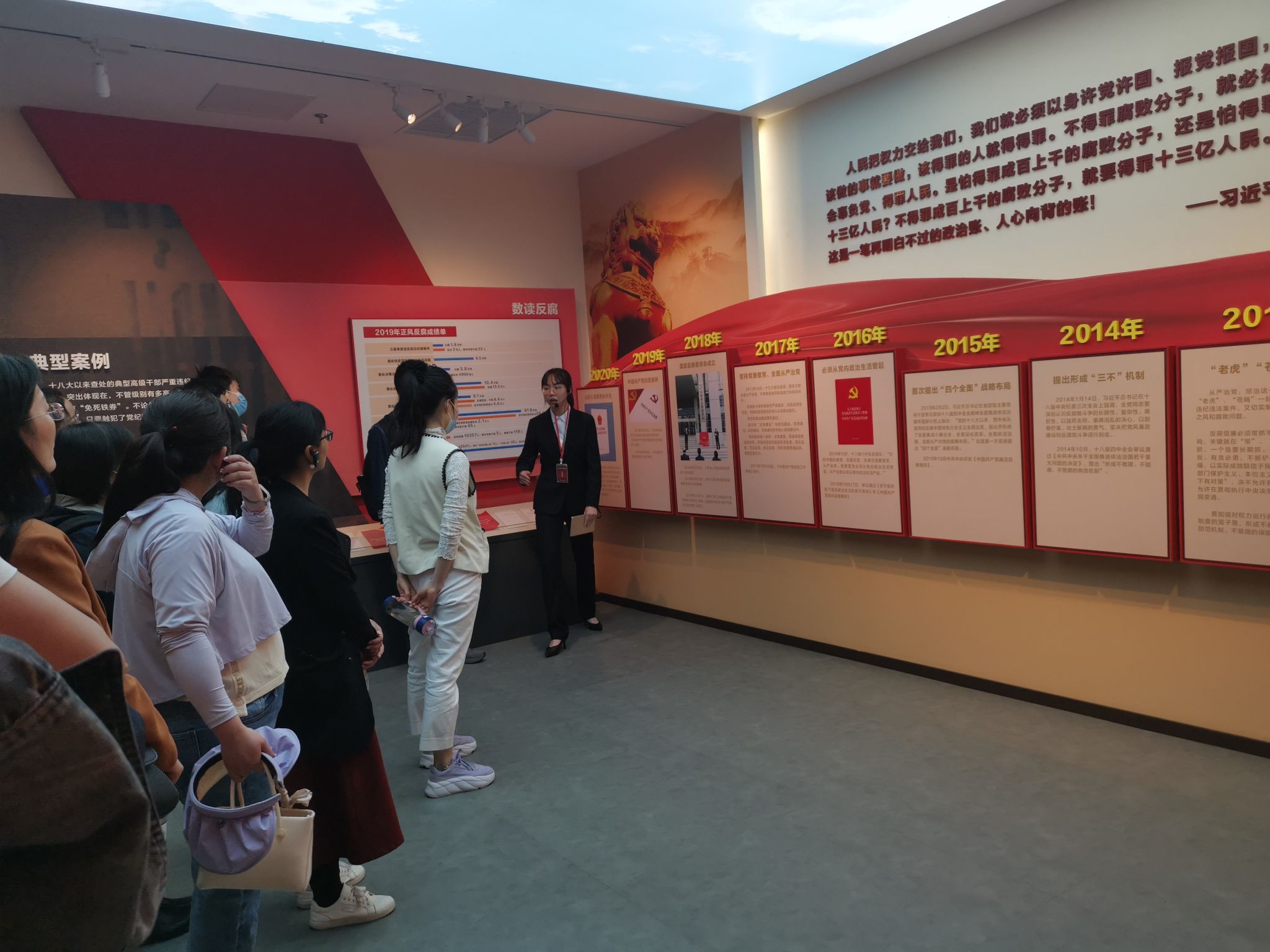 进入新时代,习近平总书记带领全党以前所未有的决心和力度推进全面从严治党,并取得了一系列丰硕成果。讲解员向师生们展示了打击贪腐的典型案例,一张张图片、一段段视频、一个个模拟实景,让大家真切体会到党中央对腐败现象决不姑息、对违法违纪现象必查必究,不断推动全面从严治党向纵深发展的坚定决心。
