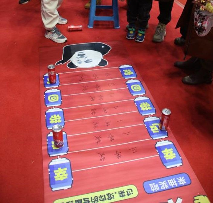 可乐停在哪里,好运就在哪里,滚动可乐瓶就能拿走小礼物,这个摊位人气超高,参与的同学认真投入,观看的同学也是激情澎拜,纷纷忍不住“指挥作战”,现场气氛高涨,十分欢乐。