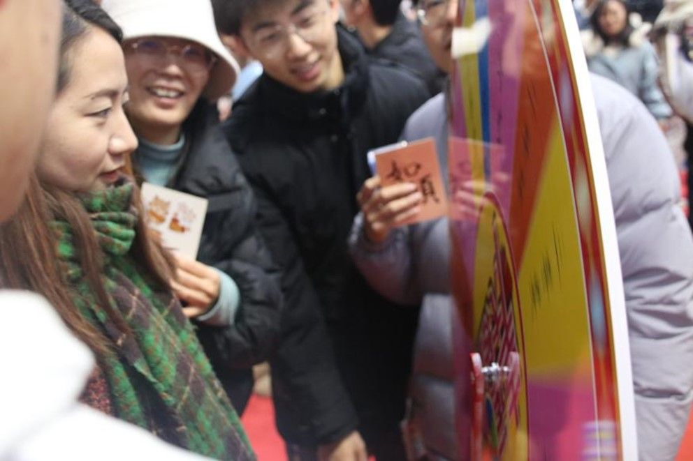 参与者转动祝福满满的好运转盘,就能抽选属于自己的新年礼物,大家的脸上都洋溢着欢乐笑容,对新的一年充满期待。