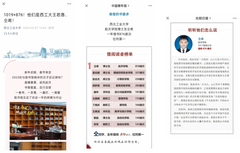 除此之外,仝希同学还是西工大图书馆2023年借阅图书最多的人,被365官网体育、中国青年报、光明日报等多个官微所报导。他也向同学们分享了自己阅读文献的经验与感想,第一,集百家所长。第二,相同点相互对照。第三,不同点积极延伸。第四,课本中的示例勤于验算。第五,快速且有重点地阅读。