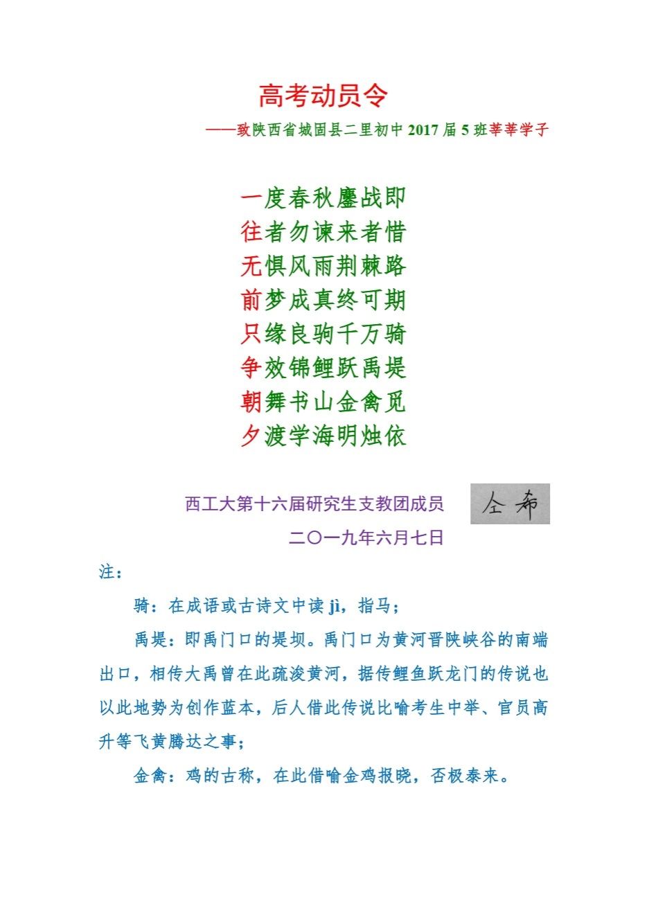 接着,支部党员仝希同志向大家分享了自己的支教经历。仝希在2014年至2015年作为西工大第十六届研究生支教团中的一员,于城固县二里中学担任语文教师兼副班主任。支教期间,他不断思考改进教学方法、自费为同学们购买书籍并在班级中设置图书角等,激发了同学们的阅读兴趣,增强了孩子们的自信心,他所带班级的语文成绩平均分和及格率均达到年级第一。支教结束后,仝希也会在中高考等关键时间节点,为员工们进行考前总动员。仝希同学被评为“陕西省老员工志愿服务西部计划优秀志愿者”、365官网体育2015年度“志愿工大——最美志愿者”个人。他结合自己的经历以“希望”“感恩”“补充”“接力”四个主题动员同学们投入到志愿服务的工作中去,助力乡村振兴。