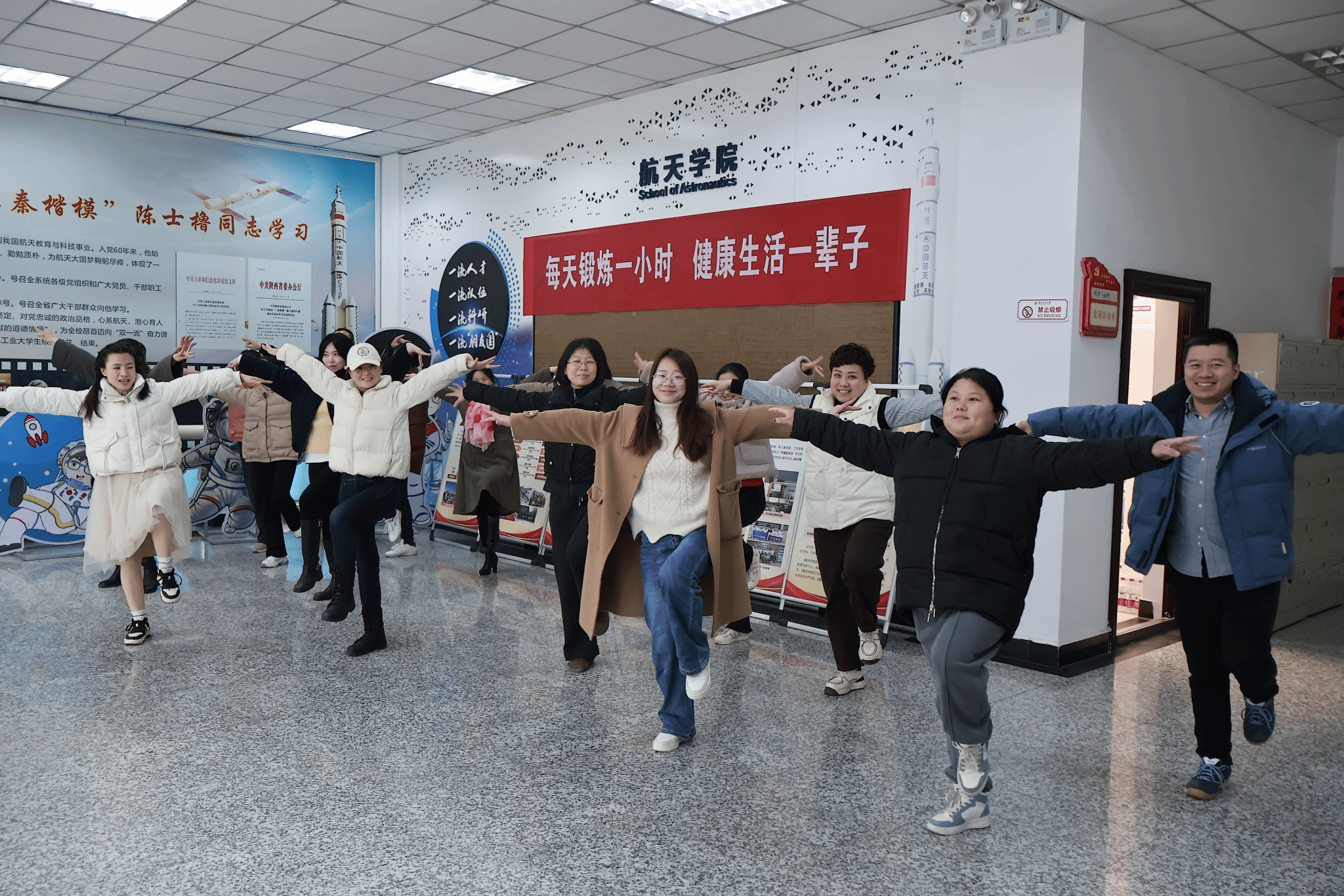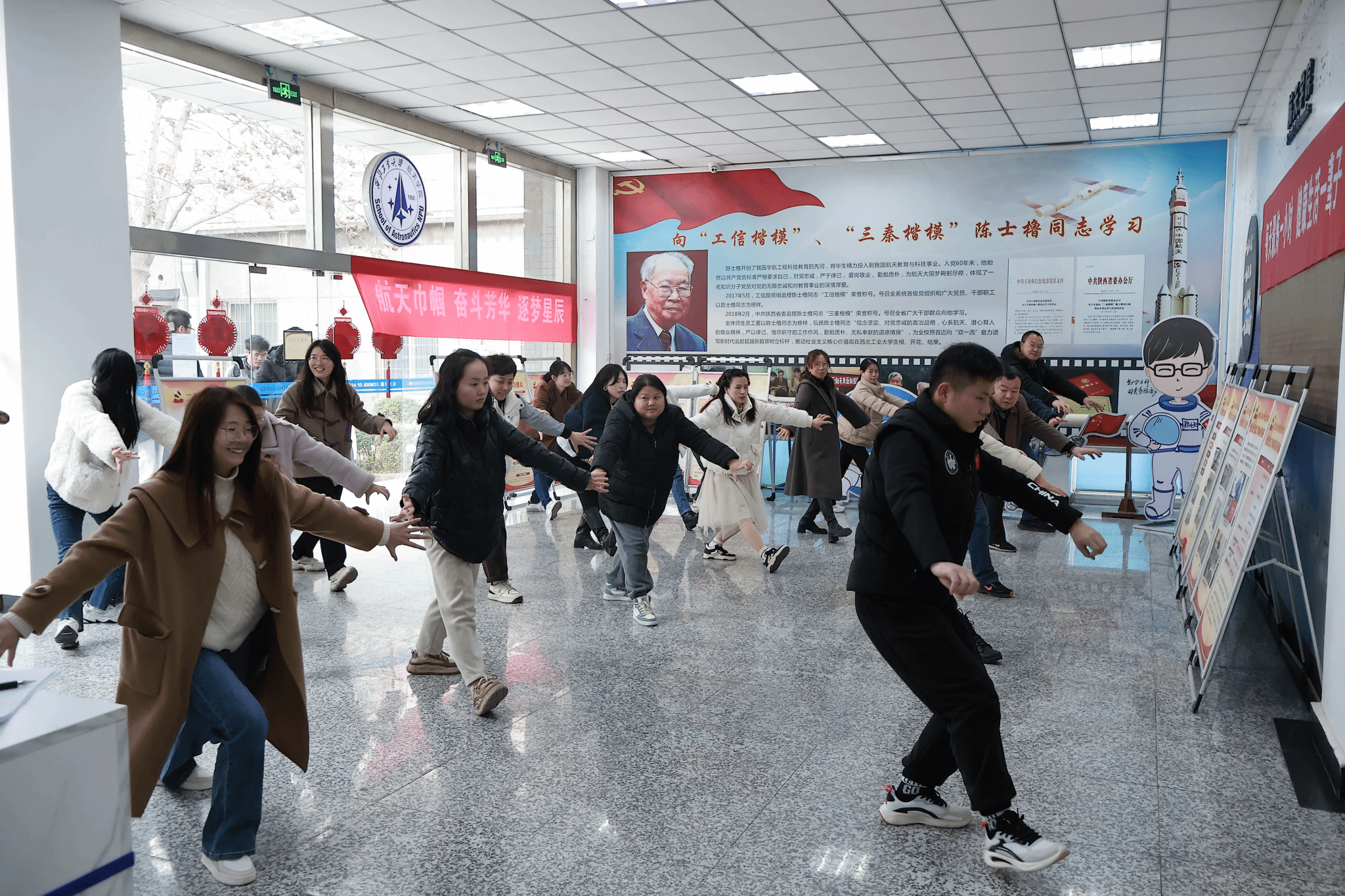 首先,体育部岳风杉老师为教职工教授五禽戏。五禽戏,作为中华传统养生功法,通过模仿虎、鹿、熊、猿、鸟五种动物的动作,调节呼吸、强身健体,对缓解久坐带来的身体不适具有显著效果。在岳风杉老师的专业指导下,教职工认真体悟动作要领,感受五禽戏带来的身心舒缓。大家逐渐进入状态,体会到传统养生功法的魅力。