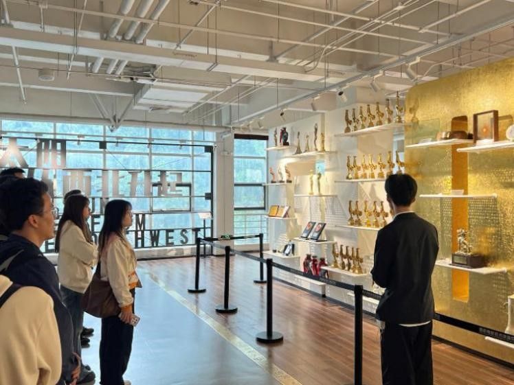 师生们在讲解员的带领下先后参观了西影星光大道、电影广场。星光大道两侧陈设了中国电影所获得的杰出奖项,一座座奖杯铭记了西影人艰苦奋斗、勇于创新的光荣历史。电影广场下的时光胶囊,书写着老一辈电影人对未来的寄托,师生们深入了解到中国电影事业在党的领导下的快速发展与西影厂的成长历程。