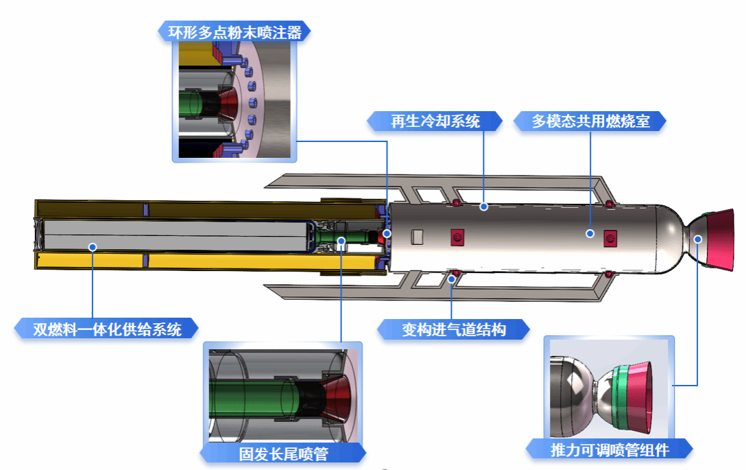 “海天擎跃”团队提出了“变构进气道双燃料跨介质动力系统”方案,基于双燃料储箱的一体化设计配合进气道结构变化实现了动力系统在水和空气介质中的稳定供能。