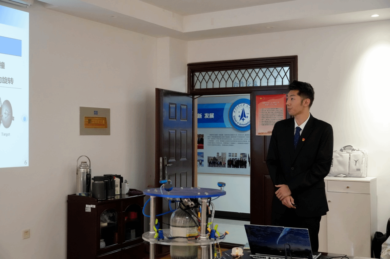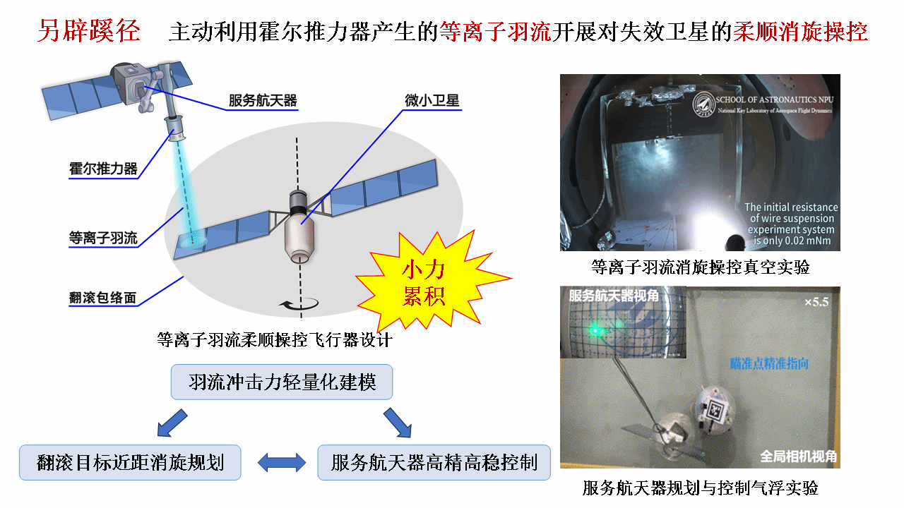 “飞羽安航”团队设计了一款“等离子羽流柔顺操控飞行器”,通过主动利用霍尔推力器产生的等离子羽流开展对失效卫星的柔顺消旋操控,相关成果为失效航天器在轨维护提供了重要的理论与实验支撑。