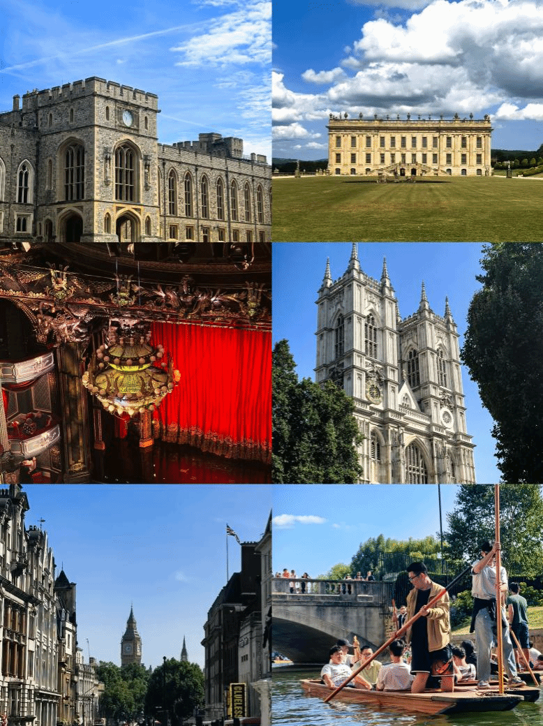 在访学期间,同学们还前往各处名胜古迹,体味异国的特色风情。同学们穿行在温莎城堡厚重的石墙高塔,感受英国王室的时代更迭;在《傲慢与偏见》中达西庄园的原型——查特斯沃思庄园里,体悟卡文迪许家族的岁月风华,《歌剧魅影》水晶吊灯下的旋律沉浮,品味悲欢交织的永恒魅影;伦敦city walk时街头巷尾的古老肌理,触摸这座日不落帝国残余的点点荣光;荡漾在康河蜿蜒的柔波倒影,寻觅百年前的徐志摩泛舟的身影;跋涉于峰区旷野连绵的草浪松涛,呼吸英格兰原野吐纳的辽远苍茫。