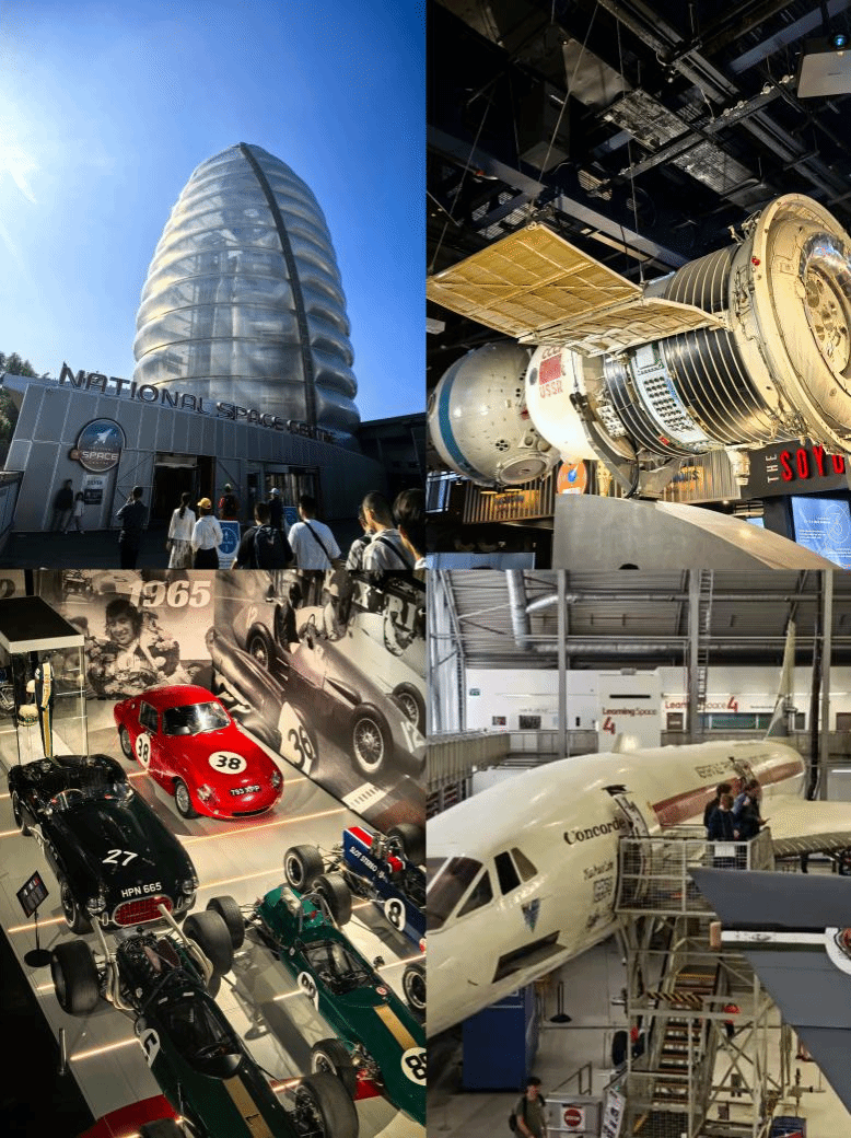 在欣赏古典名胜之外,同学们也同样领略新技术的风采。在莱斯特国家航天中心,从冷战期间太空竞赛的钢铁巨兽的缝隙中穿梭,遥望登陆火星、星际拓荒的未来。在银石赛道博物馆,耳畔阵阵内燃机的轰鸣,倾诉着眼前的荣誉赛车的峥嵘往昔。在IWM皇室战争博物馆,同学们参观世界航空发展历程,见到协和,黑鸟,B-52等经典机型,相信书本中的图片跃出,定会促进理论知识的进步,同时激发同学们对于航空航天事业的热情。