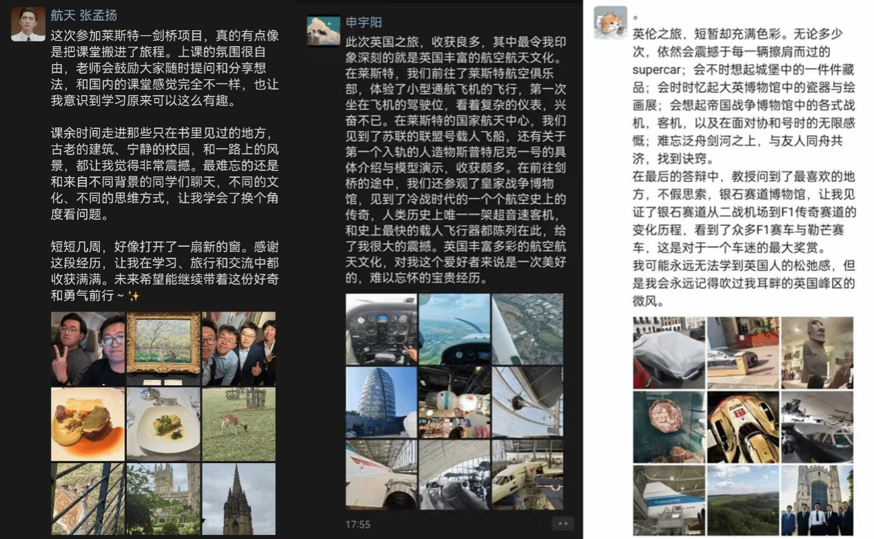 冉明哲:这10余天的英国之行,犹如走入人间的梦境。莱斯特蜿蜒的街道记录着人们静谧而生动的生活,剑桥古老的砖瓦仿佛还在诉说着过去那些非凡大脑传奇的故事。体验英国古老丰富的文化的同时,作为航天专业的员工,我参与了航天相关的活动与实验。坐在英国国家航天中心穹顶状银幕下,看人类将航天梦编织成璀璨星空。我还得以在实验室里测定计算机翼表面流体流速,完成机翼流体力学仿真。当亲手将课本上看似遥远的知识变成触手可及的实验的结果,心中油然而生的成就感在我内心深处种下对航天科研的热情。犹记那天傍晚,在灿烂的晚霞下,我和英国的同学一起组装发射水火箭模型。伴随着同学们的惊呼,水火箭腾空而起,在空中画出优美的弧线,连接着相隔万里的友谊,也好似腾起的星辰,引领我们在航天道路上不断前行。