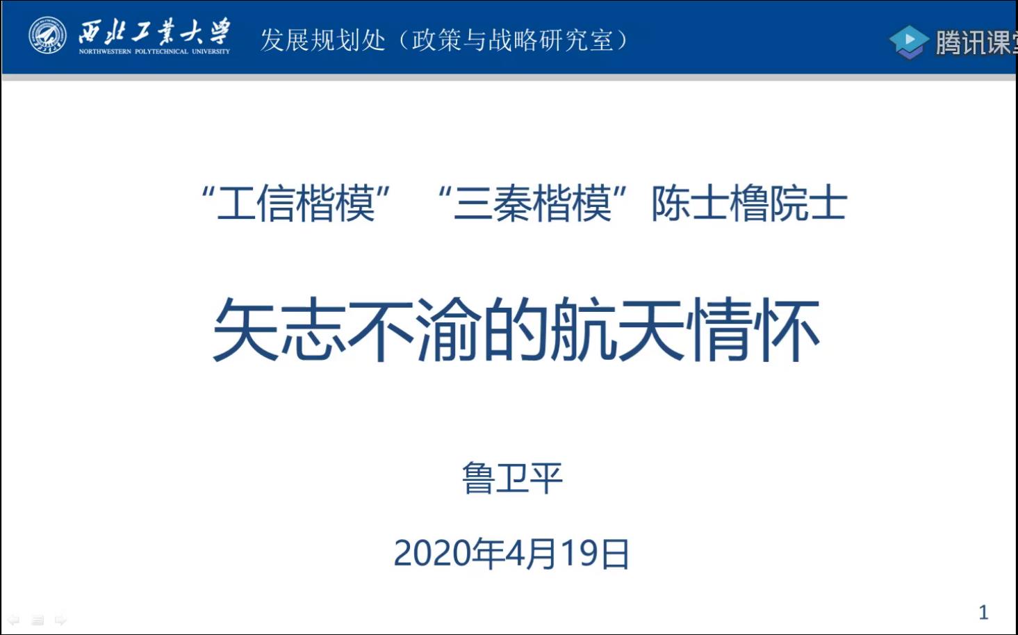 4月19日上午,beats365官方唯一入口发展对象、入党积极分子迎来新学期第一节党课。本次专题党课通过“翱翔青年云讲堂”开展,本场云讲堂由校团委、beats365官方唯一入口主办,西工大青年宣讲团、365官网体育研究生会承办,特别邀请了365官网体育政策与战略研究室主任兼发展规划处副处长、《剑指苍穹—陈士橹传》主要作者鲁卫平担任主讲人,讲述陈士橹院士“一个甲子的坚守”。